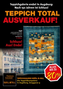 Der Tradition verbunden. 1873 legt der Seidenkaufmann Conrad Nill den Grundstein zur Firma. 1897 wird das ehemalige Handelshaus der Fugger in der Annastraße mit so historisch wertvollen Bestandteilen wie der “Goldenen Schreibstube“ Jakob Fuggers des Reichen erworben. Dem Neuen aufgeschlossen. 1898/1899 werden die beiden Fuggerhäuser zwischen Philippine-Welser-Straße und Annastraße zu einem Doppelgebäude mit repräsentativen Verkaufsräumen umgestaltet - unter der Leitung von Otto Nill entsteht das in Augsburg führende Ausstattungshaus. Zum Wiederaufbau bereit. 1949-1951 wird das im Krieg völlig zerstörte Ensemble wieder aufgebaut und von Kurt Nill mutig erweitert. Mit der 1968 erfolgten Modernisierung beweist Kröll & Nill seine Ausstattungs- und Modekompetenz in Augsburg und ganz Schwaben. Dem Besten verpflichtet. 1991 ziehen das Ausstattungshaus und die Teppichgalerie in die Zeuggasse um. Unter der Leitung von Bernd Nill präsentieren sich hier bis heute die traditionelle Knüpfkunst des Orients und das zeitgenössische Teppichdesign in der viel besuchten Teppichgalerie. Doch nun heißt es Abschied nehmen. Design deLuxe SKY FALL echt Orient, original handgeknüpft, Wolle mit Seidenglanz, ca. 250 x 350 cm, Wert € 9.750,– Abschieds-Preis € 3.900,– Samstag 11 November 10 - 18 Uhr Sonntag 12 November 12 - 18 Uhr Tag der offenen Tür Zum letzten Mal bei Kröll & Nill: Moderne Teppiche für hier und heute. Nach 150 Jahren ein letzter Blick in unsere Teppichgalerie: Riesenauswahl! Tolle Muster! Alle Größen! Topqualitäten! Wenn Sie warten, sind sie weg! Auch RUG STAR - preisr
